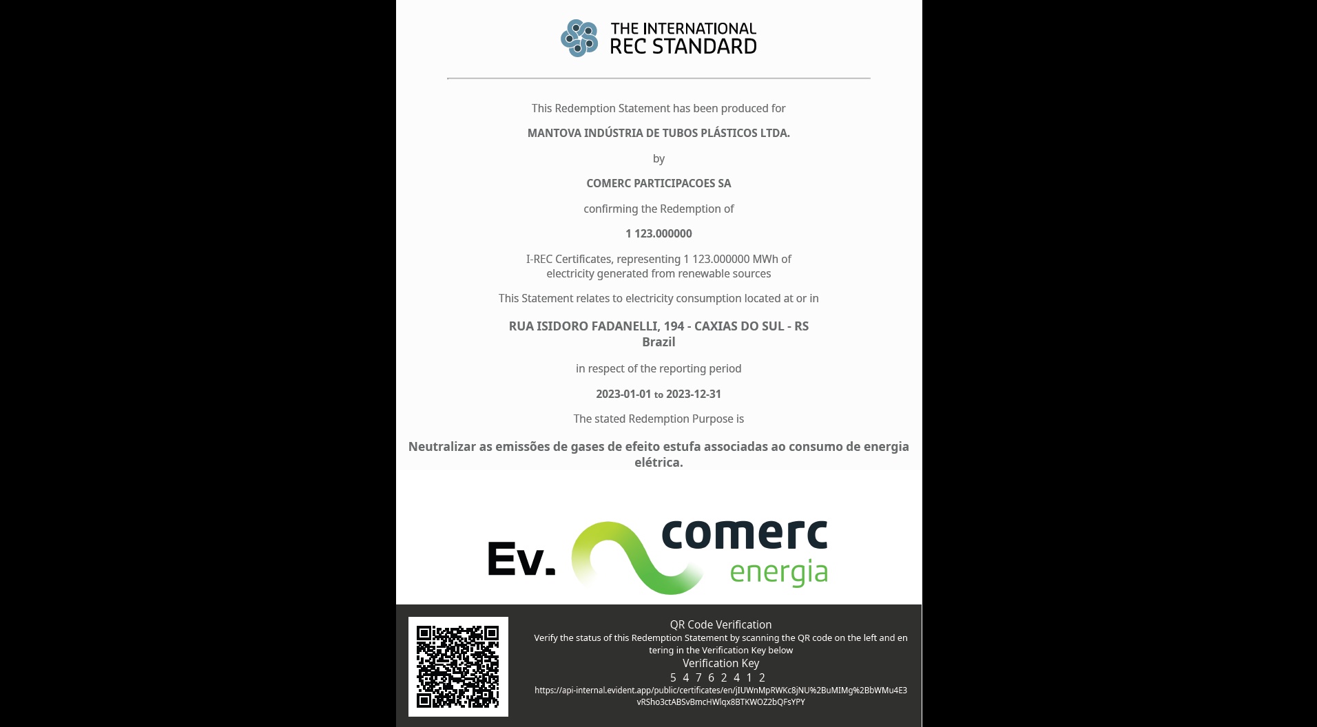 Mantova, una empresa reconocida por su innovación y dedicación a la responsabilidad ambiental, celebra el logro del Certificado Internacional de Energía Renovable (I-REC) como un paso crucial hacia la neutralidad de carbono. Este certificado global es una validación de los derechos relacionados con los atributos ambientales y sociales procedentes de fuentes de generación de energía renovable, solidificando la evidencia de que Mantova efectivamente neutralizó sus emisiones de gases de efecto invernadero asociadas al consumo de energía eléctrica en 2023.